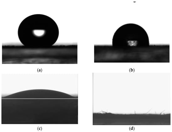 (a) Ultra-highly cross-linked adsorbent resin (contact angle 132°). (b) Activated carbon (contact angle 48°). (c) Commercial ultra-high crosslinking adsorbent resin (contact angle 98°). (d) Activated carbon fiber (contact angle 0°).