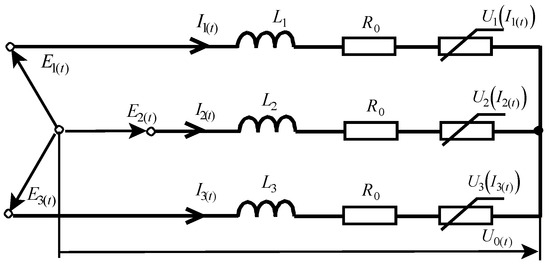11]. If in an asymmetrical linear three-wire circuit with a sinusoidal supply, this condition is not met, then the voltage exists and is sinusoidal. For non-linear loads, the voltage between the centres of the supply stars and the load is non-zero and is non-sinusoidal [