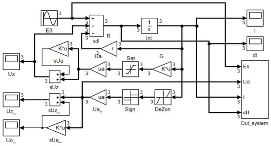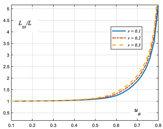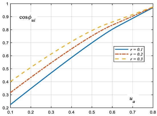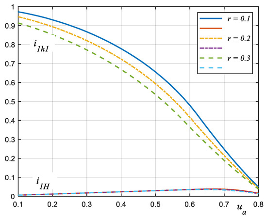 The angle ϕui is negative and has a minimum value equal to about −0.15 radians for ua = ub (38), for the maximum value of the load voltage amplitude at the load of the uninterruptible current flow. For a single-phase system, the value is lower and equal to approx. −0.24 radians. For uninterruptible current flow, the minimum value ϕui increases slightly with the value of r. Associated with the negative phase shift is the inductance in the equivalent diagram of the non-linearity. The phase shift of the current with respect to the load voltage for ua > ub tends to zero as ua increases. The values of the elements of the equivalent diagram of the nonlinear load are also determined by the amplitude of the fundamental harmonic of the current, which for ua > ub decreases quite rapidly with ua. Therefore, the elements of the equivalent diagram (including the equivalent inductance) were determined on the basis of this phase shift of the current with respect to the supply voltage and the amplitudes of the fundamental harmonic of the current and the supply voltage.