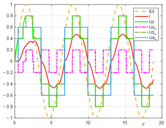 The Fourier series of voltages u1(τ) and u0(τ) contain only odd harmonics. Whereby all harmonics u0(τ) occur in the u1(τ) harmonics spectrum. They have exactly the same frequencies and amplitudes but are shifted in phase by 180°. This means that in Equation (16), triple harmonics will not occur.