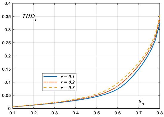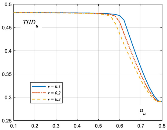 In this graph, the value of THDu for ua < ub is constant and independent of r. Only when ua exceeds this value does THDu decrease by almost twice. The minimum THDu occurs for ua ≈ 0.8.