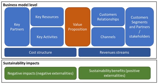 Frameworks to describe and analyze SBMs have been developed, aiming at including external costs and benefits in the analysis of the value created by a given activity, by considering its social and environmental impacts, and including a wider range of stakeholders than the classical business model approach [26,27]. The concept of Sustainable Value has been discussed as “a term encompassing the environmental, social, and economic benefits of a given model” [69], which is evaluated using the framework suggested by the authors, through stakeholders’ activities, with positive and negative values.