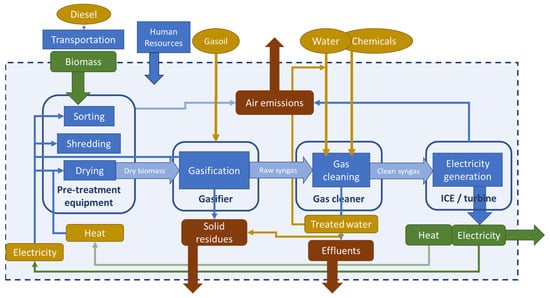 Greenhouse gas (GHG) emissions that cause climate change are mostly caused by the fossil fuel combustion for electricity and heat production (24% of GHG emissions in 2019), agriculture, land use change, and forestry (22%) [1]. The energy transition, which aims at transforming how energy is produced and consumed, should include the development of decentralized energy production from local renewable sources, including unconventional fuels, such as waste [2,3,4]. Agricultural and forestry residues can generate environmental and health burdens if inappropriately managed [5] but can be used for energy production with the advantages of the carbon neutrality inherent to biomasses, without competing with alimentation [1]. Using carbonaceous feedstocks—coal, biomass, plastics, and municipal solid waste—the gasification process has two main products: a producer gas, the useful components of which are carbon monoxide (CO) and hydrogen (H2), and solid residues, mostly ash and some biochar [6,7]. Gasification is well suited for small-scale, decentralized electricity production in rural areas with available residual biomasses [8,9,10,11,12], with environmental and socioeconomic advantages, such as better air quality, lower GHG emissions, less dependence on the fossil fuel supply and price fluctuations, and additional revenues for farmers from the sale of crop residues [13,14,15,16,17]. However, even though the levelized costs of electricity (LCOEs) of biomass gasification may be lower than the diesel-based LCOEs, diesel gensets are still the most common technology for rural electrification, mostly due to their lower investment costs [18,19]. Uncertainties about the biomass residue supply, technology adaptation, and the local technical competence for operation add to the barriers to such projects [20]. The current investment decision-making practices favor solutions with lower investment costs, proven technologies, and established markets [21]. Externalities, especially when borne by low-income rural populations, are seldom considered by private investors without appropriate regulations or incentives [22]. Generally, policy and financial incentives for energy production from residual biomasses are justified by the positive externalities generated both by fossil fuel replacement and waste valorization [16].