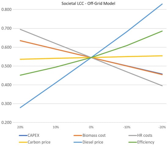 Considering the high variability observed in the literature in terms of both the net electricity yields and the externalities of small-scale biomass residue gasification, as well as variations in the costs and parameters used for the processes, sensitivity analysis was required to identify the most relevant parameters and their relative impacts on the results. The sensitivity analysis compared the impact on the Financial LCC, LCOE, and Societal LCC of the factors contributing to the most relevant shares of the LCCs. Variations of ±10% and ±20% were implemented in the model for the selected factors. Considering the relevance of GHG emission reduction and the current trends in emission pricing, an additional sensitivity aimed at identifying the GHG emission price that would equate to the LCOEs of both models, if internalized.