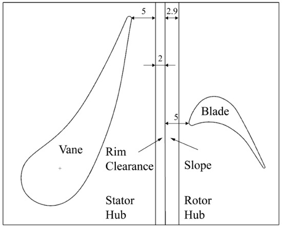 The research object of this paper is the fluid domain of the rim seal containing the one-stage rotor–stator cavity in the gas turbine, which includes the mainstream with vanes and blades and the rotor–stator cavity. There are 32 vanes and 32 blades in the cascade. The vane and blade profile is shown in Figure 1, and the height of them is 10 mm.