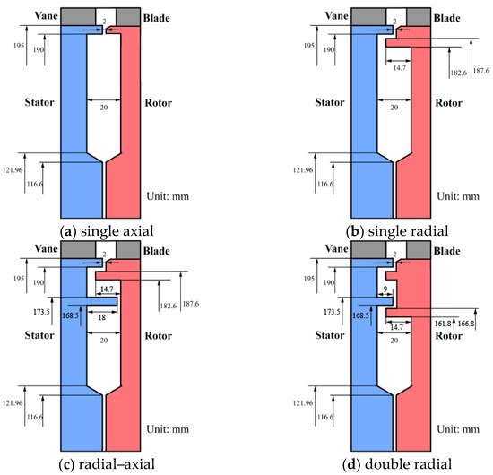 The numerical study of ingress–egress phenomena and flow characteristics at high radii is carried out for four representative sealing geometry structures that have been simplified geometrically. They are single-axial sealing, single-radial sealing, radial–axial sealing, and double-radial sealing. The specific geometry is provided in the section on computational methods.