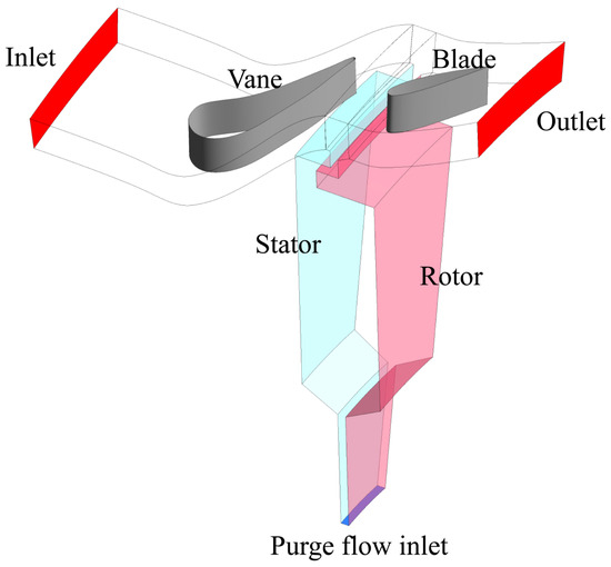 Other boundary conditions in Table 2 include mainstream inlet, mainstream outlet, purge flow inlet, and rotor–stator surface. The mainstream inlet is set as mass flow inlet; the mainstream outlet is set as pressure outlet; and the purge flow inlet is set as velocity inlet. Wu [17] was referred to in setting the rotating and static solution domain, which included the static solution domain for the vane part, and the rotating solution domain (the rotating speed is 3000 rpm) for the blade part and the cavity part. The dividing line between the two was 1 mm upstream of the rim clearance. In the rotating solution domain, the rotor surface is set as static no-clip wall referring to the adjacent zone. In the static solution domain, the stator surface is set as rotating wall (rotating speed is −3000 rpm) referring to the adjacent zone.