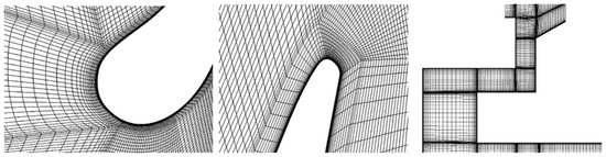 Considering that the flow conditions involved in the study include the flow in the cascade, the flow in the rim seal cavity, and the flow in the rim clearance, which is relatively complex, the mesh used in this study is a structured grid and the area near the wall is densified. In order to ensure the accuracy of the simulation of near-wall turbulence using the SST model, after several iterations, the value of y+ near the wall is about 1. The details of the grid are shown in Figure 4.