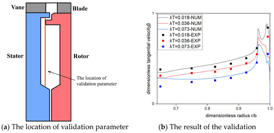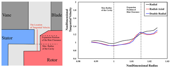 The comparison parameter is the tangential velocity ratio β, which is the dimensionless tangential velocity, calculated by the formula β = v/vr, where v is the local tangential velocity and vr is the local rotor tangential velocity. Because the rotation speed of the mainstream is high and the rotation speed of the inner cavity is low, this parameter can represent the degree of ingress there. The location of the selected parameters is in the cavity of the single-radial sealing structure shown in Figure 5a.