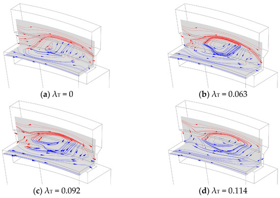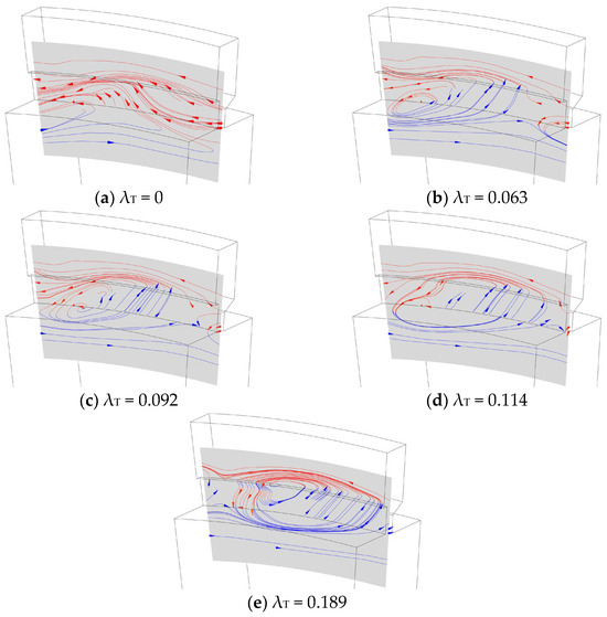 An intuitive understanding of the flow at the high radius of the single-axial seal can be obtained from the streamline diagram at different flows in Figure 6, where the red lines in the figure refer to the ingress fluid with high tangential velocity and the blue lines refer to the egress fluid with low tangential velocity.