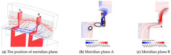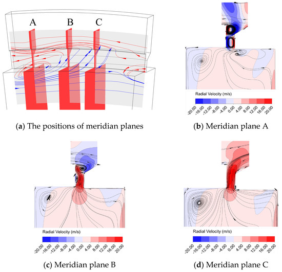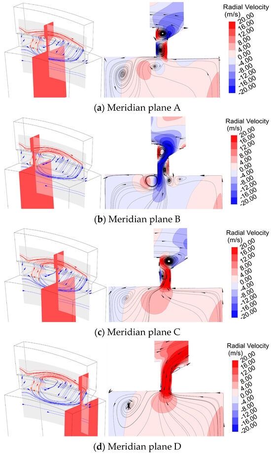 When the flowrate is low (λT = 0.063), as shown in Figure 8, similar planes are also selected to observe the streamline and radial velocity distribution, and it can be seen that the flow is similar to that in the case of high flowrate. The difference is that, when the flowrate is low, the absolute value of the radial velocity is smaller than that in the case of a high flowrate regardless of the ingress fluid or egress fluid.
