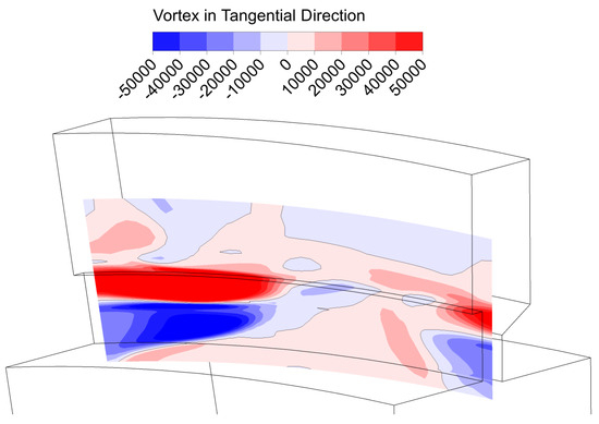 Through the above flow analysis, the circumferential region in the rim clearance can be divided into two regions: the interaction region and the outflow region. Among them, there are two vortex structure belts in the interaction region (as shown in Figure 9), and the outflow and inflow channels in this region are located in the crevice between the vortex system. The outflow area is mainly the area where the fluid flows out directly, and there are few vortex structures.
