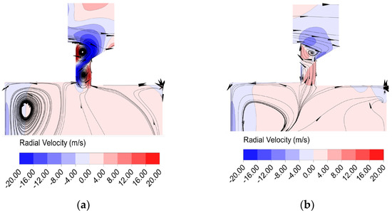 Figure 10. Distribution of streamlines and radial velocity in meridian planes (single axial; λT = 0). (a) Meridian Plane with inflow channel; (b) Meridian Plane with outflow channel.
