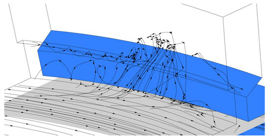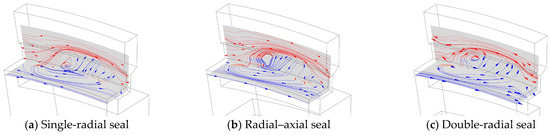 The result of the single-radial sealing shown in Figure 12 is similar to that of the single-axial sealing: there is a flow structure formed by the interaction between the ingress fluid and the egress fluid, and, with an increase in the flowrate, the depth of the ingress fluid dive into the sealing structure becomes smaller and the deflection angle becomes larger. Different from the axial sealing results, the flow structure does not shift significantly in the circumferential position as the flowrate increases, and the ingress depth of the mainstream (the red part of the streamline) is smaller under the same flowrate. Due to the radial sealing geometry, the flow structure that should have descended deeper is blocked at the corner, the ordered structure is actually destroyed, and the complete flow structure is divided into two parts.