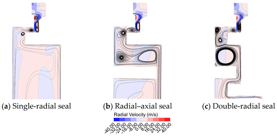 Figure 16 shows the partial cavity streamlines and radial velocity distributions of single-radial sealing, radial–axial sealing, and double-radial sealing when the flow parameter λT = 0.063. It can be seen that the distributions of the three vortex systems in the outermost layer are basically the same due to the influence of the radial sealing geometry. In the inner layer structure, the purge flow fluid flows into the sealing structure by the rotor side. On account of the different sizes and shapes of the cavities of the different sealing structures, the vortex structure at the same radius shows different morphology, and the sealing characteristics are different due to the different interactions between the ingress and egress fluid in the different vortex structures.