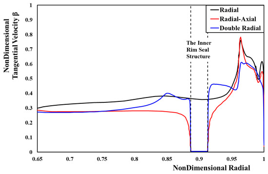 The relationship between flow characteristics and sealing characteristics can be better explained by comparing the dimensionless tangential velocity β values under different sealing geometry conditions. As the circumferential inhomogeneity at a high radius is more significant, the circumferential average operation is performed on the β values at high radii of the three structures to obtain the results shown in Figure 15. Indeed, the β value of the double-layer sealing structure is lower than that of the single-layer structure on the whole, and the sealing effect is better, but the β value of the double-layer structure is slightly higher than that of the single-layer structure near the expansion of the rim clearance. There are only slight differences between the radial–axial seal and double-radial seal.