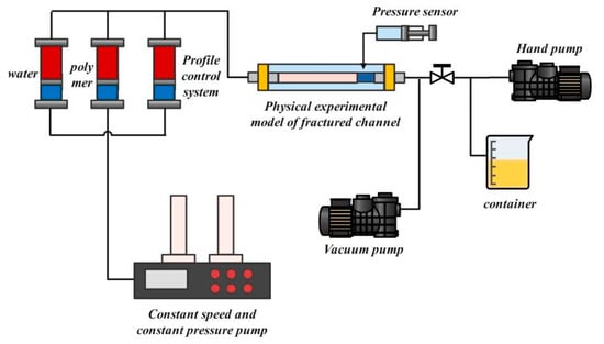 An experimental model of fractured high-intensity water flooding was established to analyze the change in characteristics of pore structure, mineral composition, and remaining oil distribution at different locations near fractures. The experimental process is shown in Figure 1.