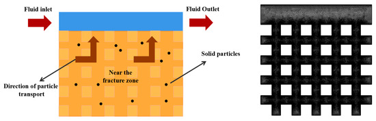 Based on the results of the previous section, the formation mechanism of the fracture-flush zone-low saturation area in high-water content oil reservoirs was preliminarily determined. However, due to limited experimental conditions, it was challenging to accurately describe the influencing factors in the formation of the fracture-flush zone-low saturation area in high-water content oil reservoirs. Therefore, in this section, finite element simulation methods are employed to simulate the fluid flow and clay particle migration characteristics within the fracture-flush zone and the flush zone-low saturation area. The established porous media simulation and grid partitioning are illustrated in Figure 9.