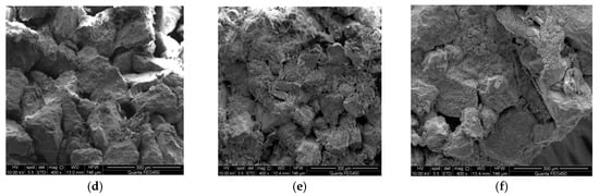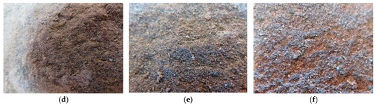 The surface structures of the rock cores at different distances from the fracture. (a) 1#; (b) 2#; (c) 3#; (d) 4#; (e) 5#; (f) 6#.