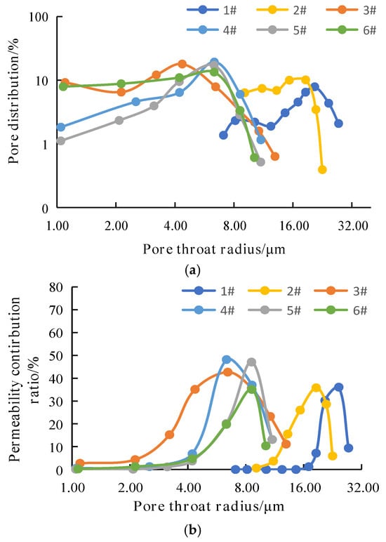Mercury injection results of the rock core. (a) Curve of pore throat radius distribution frequency; (b) Curve of pore throat radius contribution to permeability.