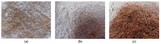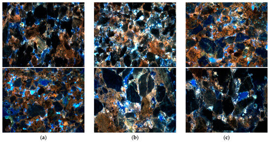 According to the study in Section 3.1, under strong jetting conditions, the clay minerals cemented in the rock within the formation are severely flushed, and fine particles are easily carried away by the strong entraining fluid. This leads to an increase in the pores of the rocks near the fracture. To further investigate the characteristics of the fracture-jetting zone and the low-saturation oil area in high-water-cut oil reservoirs, an analysis of the microscopic residual oil changes in the rock under strong jetting conditions was conducted. The appearance of the rock cores at different distances from the fracture was observed, as shown in Figure 6.