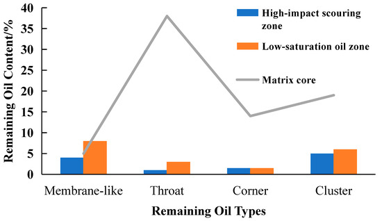 From Figure 8, it can be observed that, for the matrix core, it is mainly dominated by throat and cluster oil. This is because the oil inside the throat remains stable without displacement, resulting in a higher oil content. Clustered oil is formed during the saturation process where oil and water shear each other in the porous medium. Film oil occurs after displacement, where some oil is adsorbed on the rock surface due to adsorption, contributing to the lower content of film oil in the matrix core.
