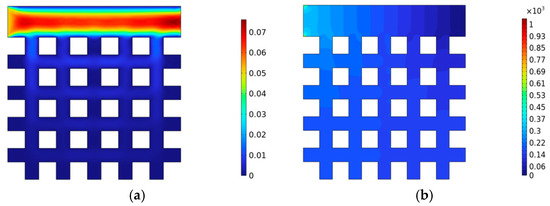 Through simulation, it can be assumed that the fluid velocity and pressure remain stable during the flushing process, with relatively small variations over time. Additionally, from Figure 9, it can be observed that the fluid velocity at the crack end is relatively high, reaching up to 0.075 m/s, while the fluid velocity at the far end of the crack is relatively small, with local fluid velocity in surrounding dead pores being 0 m/s. The significant difference in fluid velocity between different regions indicates that the flow of fluid at the crack end affects the flow state of the fluid near the crack end.