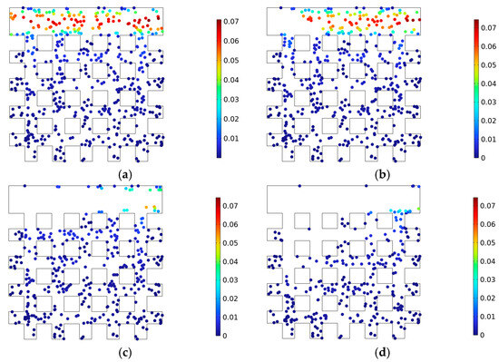 From Figure 10, it can be observed that with the increase in simulation time, the distribution state of clay particles near the crack end undergoes significant changes. The clay particles near the crack end are carried away by the incoming fluid, flowing out through the exit crack. Moreover, the closer to the entrance, the stronger the fluid’s carrying capacity. In contrast, the clay particles in the pores located at the far end of the crack show no significant changes. This indicates that the flow of fluid within the crack does have an impact on poorly cemented clay particles, causing them to detach from the originally stable cemented surface and enter the crack. This ultimately results in an increase in pore size near the crack end, forming a high-permeability zone.