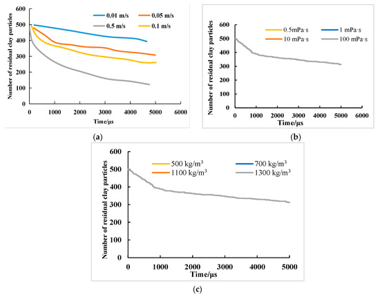 Impact of different parameters on the number of residual clay particles. (a) Variation in the number of residual clay particles under different flow velocities; (b) change in the number of residual clay particles under different fluid viscosities; (c) change in the number of residual clay particles under different particle densities.