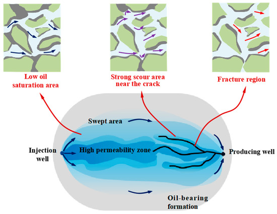 After prolonged development of water-flooded oilfields, injecting water near the wellbore area can easily lead to the formation of relatively complex high-permeability zones. Particularly, following extended water flooding, differences in the structure and saturation levels of fractures and surrounding pore channels (dominant fluid flow pathways within the reservoir) can establish dominant flow pathways, significantly impacting the development efficiency of water flooding [1,2,3,4,5,6,7,8]. Through research, scholars have primarily focused on the formation, distribution status, and identification methods of large channels within actual formations. However, there has been a lack of further investigation into the mechanisms behind their formation, and a clear classification of large channels primarily dominated by fractures has not been established [9,10,11,12,13,14,15].