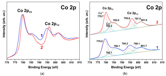 XPS Co2p spectrum of h-Zn-Co-O/NF electrode annealed at 300 °C in air before (1) and after treatment for 10 min in 3.5 M KOH (2) (a) Deconvolution of the same spectra into individual components is shown by dashed lines in red (Co3+), blue (Co2+), and green (satellite band) colors (b).