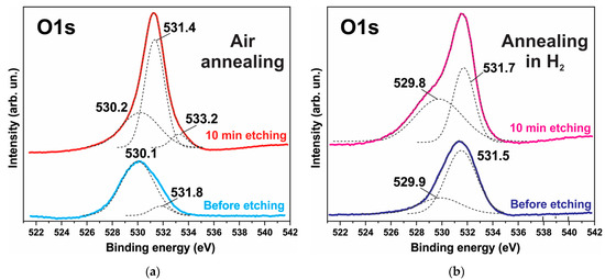 XPS O1s spectrum of the h-Zn-Co-O/NF electrode annealed in either air (a) or H2 (b) atmosphere before and after treatment for 10 min in 3.5 M KOH. The deconvolution of the spectrum into individual components is shown by the dotted lines.