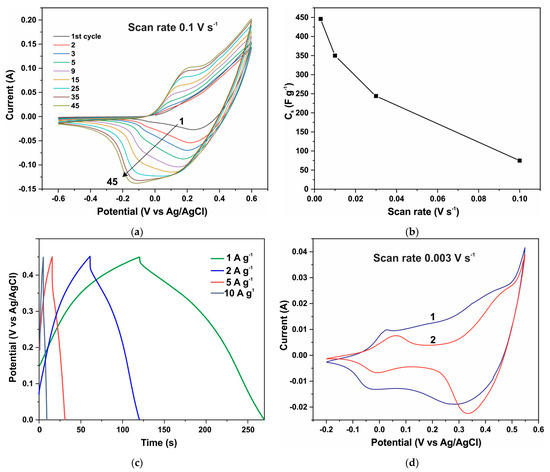 CV curves of the h-Zn-Co-O/NF electrode during the first 45 CV cycles at a speed of 0.1 V s−1 (a); specific capacitance versus scanning speed of CV curves (b); GCD curves after establishing stationary CV curves (c); CV curves after stabilization of characteristics (curve 1) and after a week of aging in air (curve 2) (d).