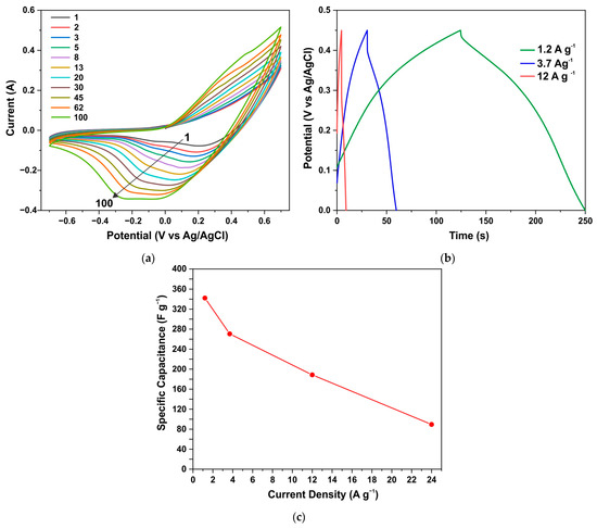 Similar results are demonstrated by an electrode from a sample obtained through the synthesis of AcCo+NZn followed by annealing in air. Figure 10a shows the CV characteristics for such an electrode measured during the first 100 cycles at a scan rate of 0.3 V s−1. Here the capacitance also increases significantly during CV measurements until stationary CV curves were obtained after ~15 min of measurements. Figure 10b,c show the GCD curves and specific capacitance versus current density for the annealed AcCo+NZn electrode, respectively. The specific capacitance measured using the GCD method at a current density of 1.2 A g−1 was 341 F g−1 and this decreased to 89 F g−1 at a current of 12 A g−1.