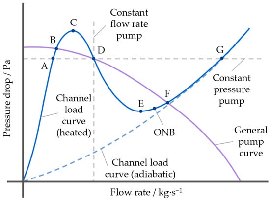 Extensive research has been conducted on the phenomenon of Ledinegg instability, focusing on conducting quantitative experimental analysis and developing mathematical models for the pressure drop. Initially, different quantities flowing through parallel-connected tubes were observed despite approximately equal heating [5]. Results obtained in the experiment suggest that once a tube somehow contains less working fluid than the others, vapor will possibly generate, causing an increase in flow resistance and thus a decrease in heat dissipation. Consequently, the flow rate continues to decrease until it reaches a new equilibrium state. The appearance of such instability was verified to be related to the non-monotonicity of the boiling flow pressure drop curve. Subsequently, research has demonstrated that the distributions of flow rates, their hysteresis, and the onset of excursion phenomena in parallel systems can be estimated from pressure drop versus flow rate curves in single tubes [7,8]. Ledinegg instability and uneven distribution occur when the characteristic curve exhibits negative tangents, despite the approximate similarity of the curves of each tube. Further, the onset of flow instability (OFI) is defined as the occurrence of a minimum in the pressure drop curve (point E in Figure 1) [9], associated with a constant pressure pump. For general pumps, stability judgment is made based on the relative magnitude of the partial derivatives at the current operating point.