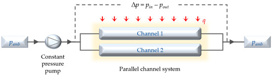 The schematic layout of the system is shown in Figure 2. This study examines a parallel channel system cooperating with a constant pressure pump. Water serves as the working fluid. Each channel has both width and height measuring 0.0002 m. The system is supplied with fluid at a fixed mass flow rate (W) and a constant pressure outlet (pout = 101,325 Pa). The microchannels are thermally isolated from each other. Uniform heat fluxes (q) are applied to the channels’ wall. The thermal resistance of the wall is neglected to simplify the solution for the energy equation.