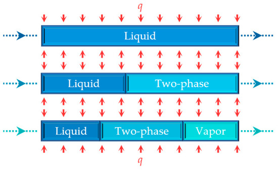 The underlying assumption of Equation (2) is proposed by Martinelli et al. [16] and depicted in Figure 3. With sufficient heat flux applied to the channel, the subcooled working fluid can always start boiling and transition into superheated vapor at any location. Given this observation, the channel can be equivalently divided into several flow parts along the axial direction. In each part of the microchannel, i.e., liquid phase part (σ = 0), liquid–vapor two-phase part (0 < σ < 1), and vapor phase part (σ = 1), the pressure gradient can be independently calculated by Equation (2) by incorporating the local value of σ.