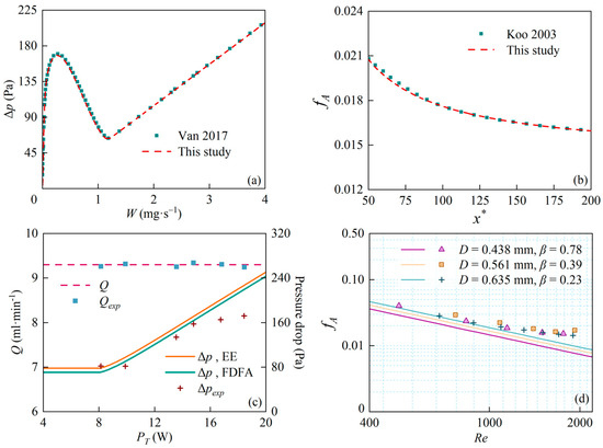 Specifically, Figure 4a,b presents a comparison with numerical results, while Figure 4c,d displays a comparison with experimental data. It is noteworthy in Figure 4c that the pressure drop obtained through our model directly with power input PT is slightly higher than the experimental result, since the exact fluid heat absorption was reduced due to thermal resistance and power loss. Further, it is indicated from Figure 4d that Equation (24) is more accurate for laminar flows. As depicted in the figure, the results of pressure drop and apparent friction factor align well with both numerical and experimental references, indicating the effectiveness of our method.