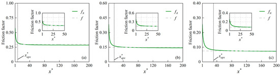 Figure 6 presents the comparison between f and fA. Results are conducted with x* ranging from 1 to 200 and Re set at 50/100/200, respectively. As depicted in the figure, the relative deviation between these two friction factors increases with decreasing x* due to a greater pressure gradient. Additionally, fA converges towards f at a diminished rate as Re increases. For a microchannel operating under larger Re, it is necessary to increase x* to directly substitute fA with f (i.e., to apply the assumption of fully developed flow to the entire channel).