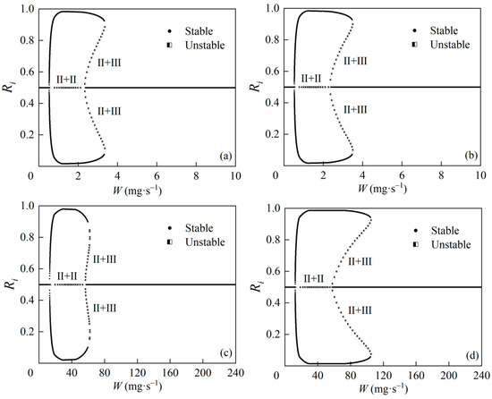 All possible flow rate combinations between parallel channels are depicted in Figure 7b,d. According to Section 2.3, flow instability will only occur in the combined case when at least one channel is operating in Zone II. The pressure drop curves of a single channel in Figure 7 reveal that the absolute slope values decrease sequentially from Zone I to Zone III. By referring to the instability criteria described in Section 2.3, the combined operating conditions of II + II and II + III are unstable.