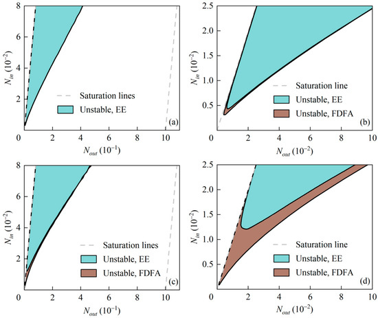 The two dashed lines in Figure 9, representing Nin = Nout and Nout = 1, respectively, correspond to saturated liquid and saturated vapor at the outlet. The area between these lines signifies conditions in which the working fluid at the outlet is in a two-phase flow state. As shown in the figure, all the unstable regions are located between the two saturation lines, suggesting that flow instability can only occur when the channel operates with two-phase flow. Such an unstable region corresponds to the area where Nout > Nin, indicating vapor generation.