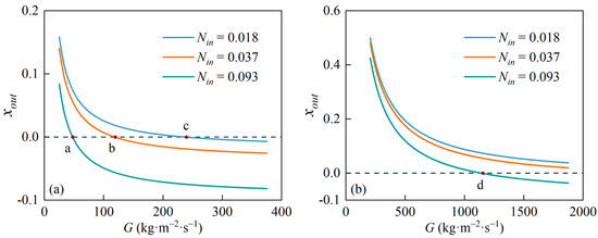 Clearly, xout characterizes the difference between the vaporization margin due to inlet subcooling and the heat absorbed by the fluid. The special cases of xout = 0 and xout = 1 lead to the minimum and maximum values of the characteristic length of two-phase flow in the channel (i.e., Ltp,min = 0 and Ltp,max = L). Especially in cases of point a, b, c, and d in Figure 11 where xout = 0, which corresponds to the vanishing of the two-phase flow region, the partial derivative of the outlet quality with respect to the mass flux is: