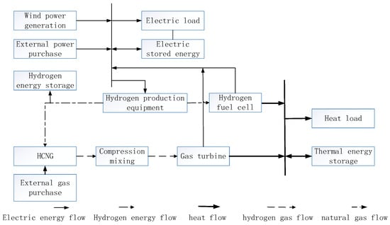 The above literature basically only considers the feasibility of hydrogen energy integration into the traditional electric integrated energy system and the feasibility of electric hydrogen production technology to absorb new energy such as wind, but with the large-scale grid connection of new energy, cost has become the most important factor limiting the hydrogen production and hydrogen energy utilization of renewable energy. In 2019, hydrogen energy was written into the Government Work Report for the first time [12]. Therefore, it is necessary to fully combine demand response technology and green energy use policy, actively exert the coupling scheduling potential of hydrogen energy, and promote the low-carbon transformation of the integrated energy system under the context of ensuring high economic benefits. Because the basic equipment for hydrogen distribution is not perfect, hydrogen-enriched compressed natural gas (HCNG) came into being. After hydrogen is mixed with natural gas to form hydrogen-doped natural gas, it can be transmitted directly using natural gas pipelines currently in operation [13]. Reference [14] introduced gas hydrogen mixing technology into the integrated energy multi-microgrid and compared the economic benefits under different percentages of hydrogen incorporation but did not consider the impact of dynamic changes in the hydrogen mixing ratio on the system. Reference [15] combined the gas hydrogen blending technology and the carbon trading mechanism to analyze the impact of gas hydrogen blending technology on the low-carbon property of the system, but it did not fully utilize the potential of hydrogen energy scheduling and did not combine the load response ability. For new energy power generation and carbon emission reduction, China has introduced the green power certificate policy trading mode. Reference [16] introduced the joint trading mechanism of carbon trade green certificate market, which improved the proportion of green electricity in the system during the dispatch cycle and promoted the consumption of new energy power. Reference [17] optimizes the load matching degree through demand response to optimize equipment operating costs and carbon emissions.
