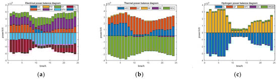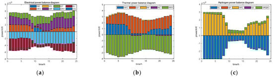 Energy balance plot under Scenario 3: (a) electrical power balance in Scenario 3, (b) thermal power balance in Scenario 3, and (c) hydrogen power balance diagram in Scenario 3.