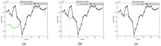 Wind power output and energy consumption in different scenarios: (a) Scenario 1: electrical absorption of stroke; (b) Scenario 2: electrical absorption of stroke; and (c) Scenario 3: electrical absorption of stroke.