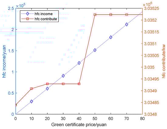 Referring to the price fluctuation range of each green certificate in recent years, the price of the unit green certificate is in the range of CNY 0–80. Green certificate income and output of hydrogen fuel cells under different green certificate prices are considered, and their variations are shown in Figure 5.