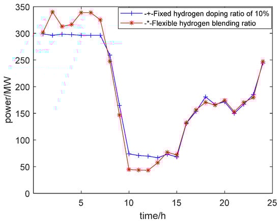 The system operating costs in different scenarios are shown in Table 1. Compared to Scenario 1, in Scenario 2 and Scenario 3, due to the addition of electrical–hydrogen coupling equipment in the system, the operating cost of system equipment is increased. However, compared to Scenario 1, due to the addition of hydrogen production and hydrogen use equipment, the utilization rate of wind power is increased by 17.68% and 19.73%, respectively, the wind power abandonment cost is reduced, and the unit output is increased. In Scenario 2, Scenario 3 considers the variation in the hydrogen blending ratio in hydrogen-doped natural gas, and the equipment operation cost is the highest among the three scenarios. However, due to the enhanced system flexibility and better unit output, the system wind abandonment penalty, carbon emission cost, and energy purchasing cost are all lower than in Scenario 2.