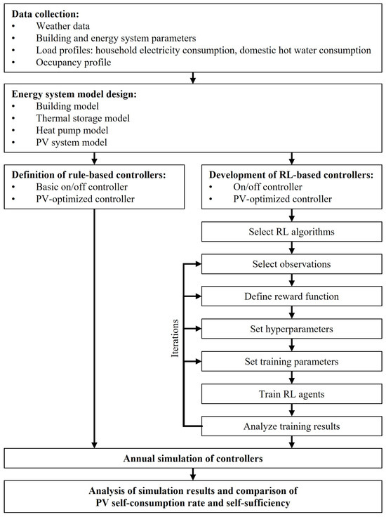 Two rule-based controllers were defined for reference (Section 2.2). The development of the two RL-based controllers (Section 2.3) was an iterative process. First, suitable RL methods were selected, followed by the selection of the observations, the definition of the reward function, and the setting of the hyperparameters and the training parameters. The next step was the training of the RL agents and the analysis of the training results. Based on the success of the training, adjustments of the observations, reward function, hyperparameters, and training parameters were made iteratively until the training results were satisfactory. Finally, the two rule-based and two RL-based controllers were used in an annual simulation. The two PV-optimized controllers were compared to each other by the performance indicators PV self-consumption and self-sufficiency (Section 3).