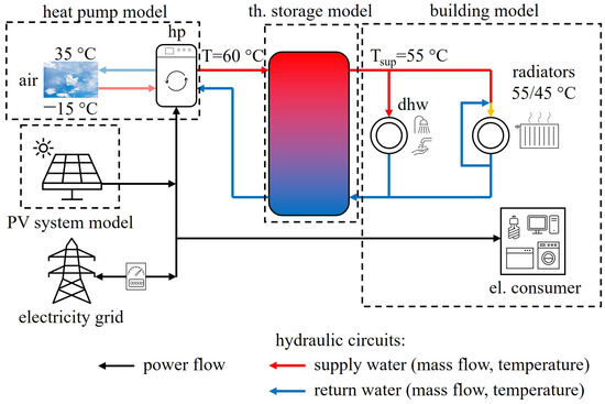 Investigated building energy system consisting of the electric and thermal consumers (right side), the thermal storage (in the middle), an air-to-water heat pump, and the PV system (left side).