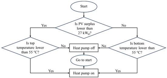 There are several rule-based approaches to better match the heat pump electricity consumption and PV generation, often taking advantage of the modulation of the heat pump. The controller used here (PV-optimized controller) is designed to use most of the PV electricity that is not directly used in the households (PV surplus). If there is no PV surplus, the controller only runs the heat pump to keep the top storage temperature at 55 °C to ensure the heat supply. If the PV surplus exceeds the limit defined by the electricity consumption of the heat pump at the lowest modulation level (27 kWel at 30%), the heat pump is switched on and modulated to consume exactly the PV surplus as long as the bottom storage temperature is lower than or equal to 55 °C. This approach is shown in Figure 3.